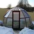 Нестандартная красивая и сверхпрочная конструкция с покрытием из сотового поликарбоната CARBOGLASS, толщиной до 10 мм, которая станет объектом повышенного внимания на любом приусадебном участке. Отлично подходит для создания зимнего сада и выращивания в нем цветов и небольших деревьев. Оранжерею можно без проблем использовать, как обычную теплицу для овощей, фруктов или зелени.