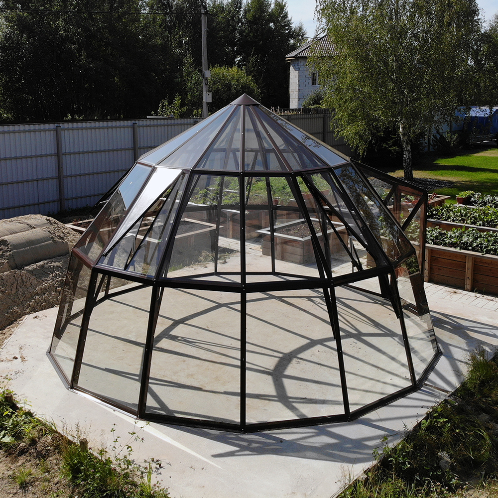 В процессе заказа оранжереи, вы можете выбрать необходимый диаметр, в пределах от 2.5 до 6 метров, от которого будет зависеть высота конструкции, необходимое количество вентиляционных форточек, а также двери — комплект раздвижных «купе» или распашная из алюминия. Возможен также выбор предпочтительного цветового решения для стальных элементов каркаса с использованием метода полимерно-порошковой окраски.