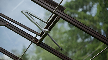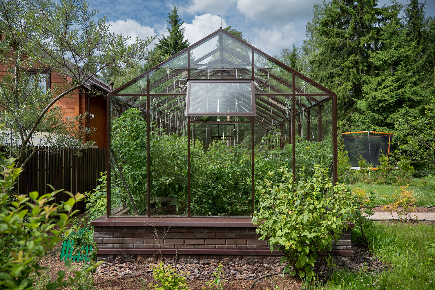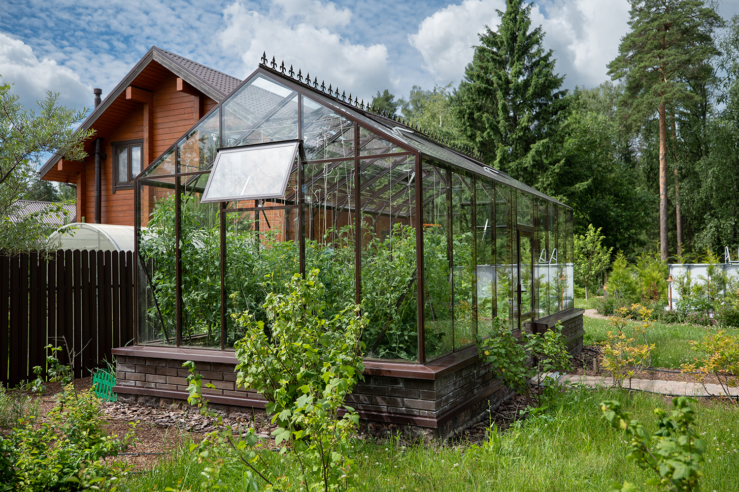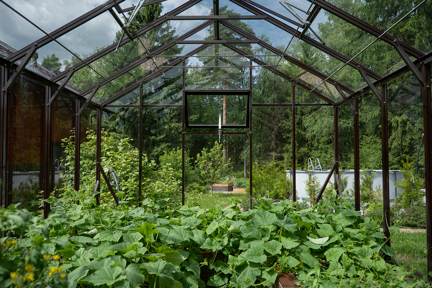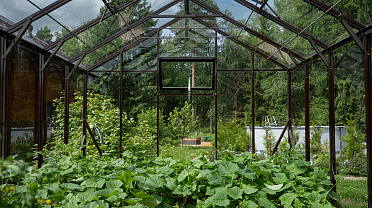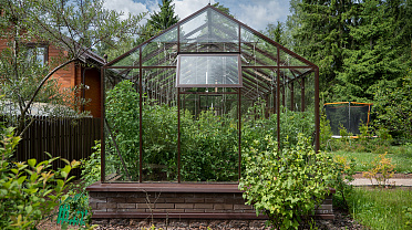 Боковое размещение входа формирует более гибкую планировку и удобную логику использования пространства. Такое решение упрощает зонирование внутри и делает перемещение более естественным, позволяя органично вписать теплицу в участок и создать продуманную и комфортную рабочую среду.