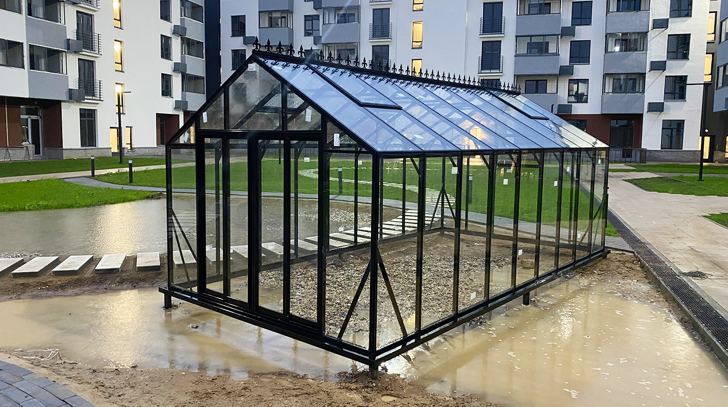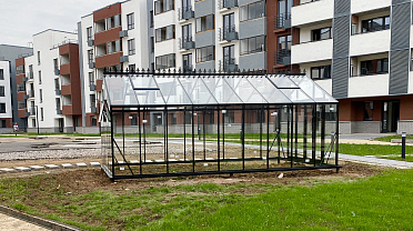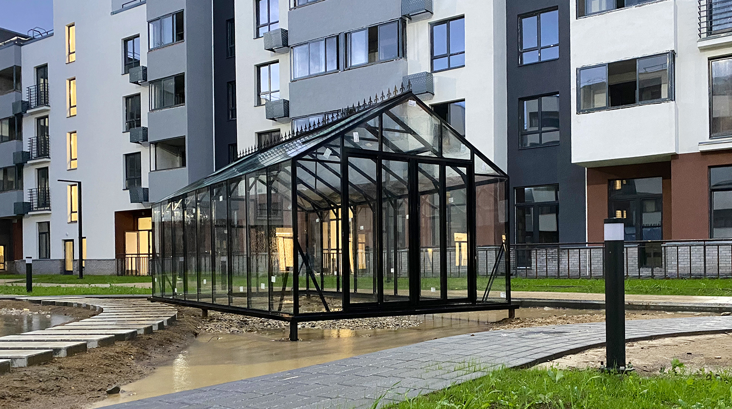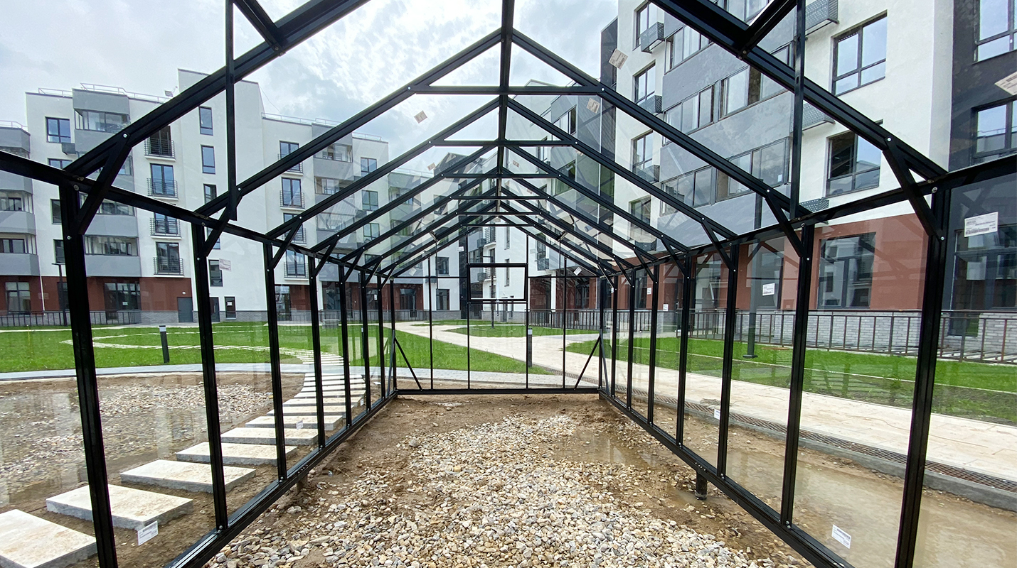 Решение, адаптированное для городской среды и жилой застройки. Теплица органично интегрируется в пространство ЖК, сохраняя аккуратную архитектуру и создавая функциональное место для выращивания в условиях города.