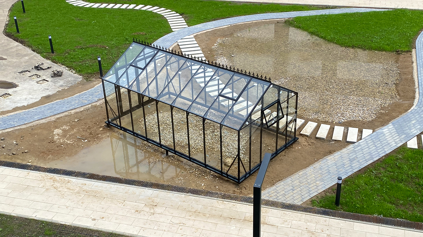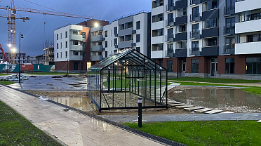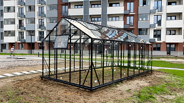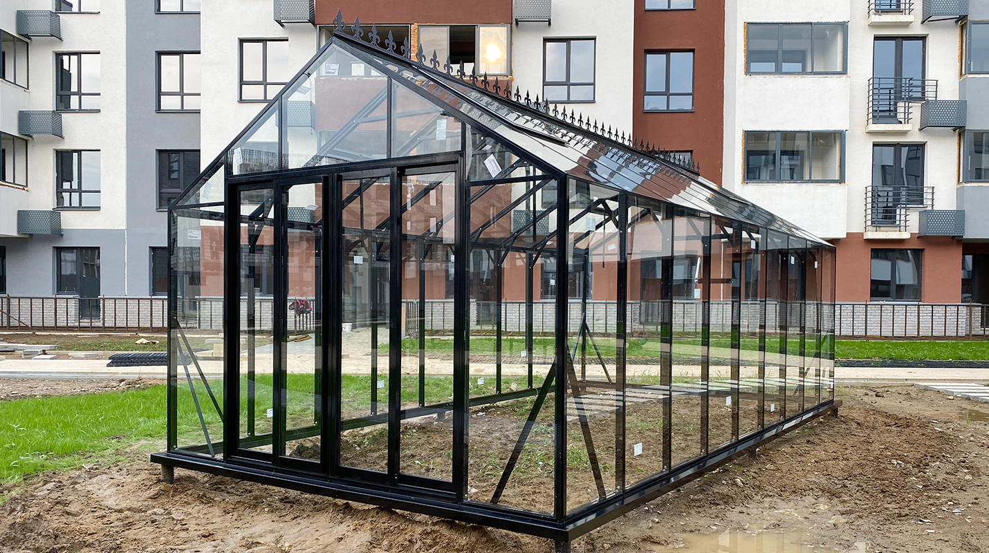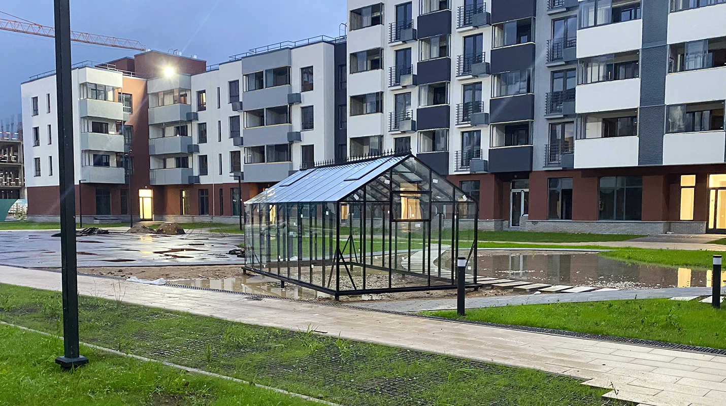 Решение, адаптированное для городской среды и жилой застройки. Теплица органично интегрируется в пространство ЖК, сохраняя аккуратную архитектуру и создавая функциональное место для выращивания в условиях города.
