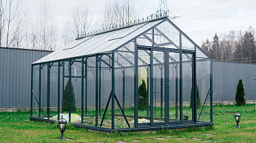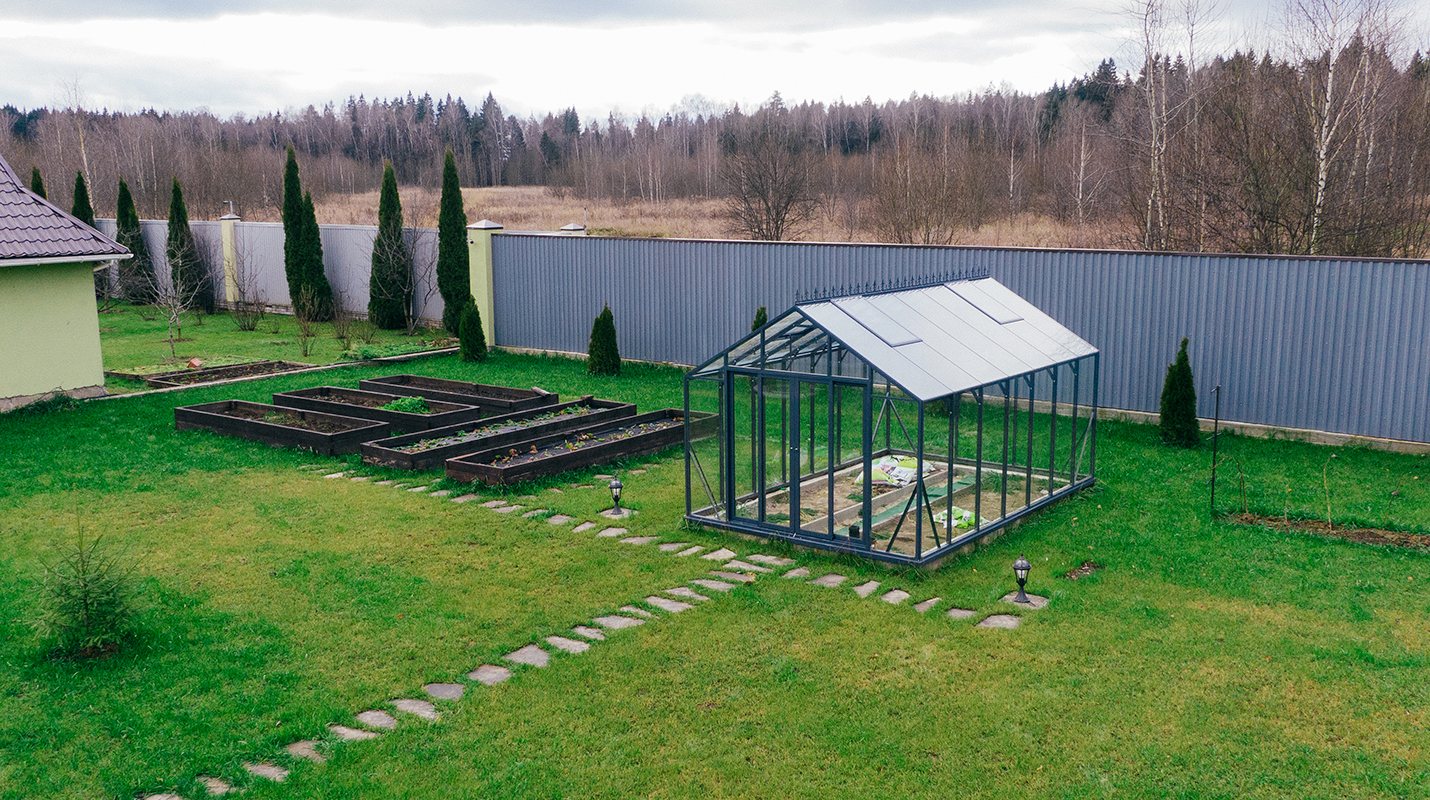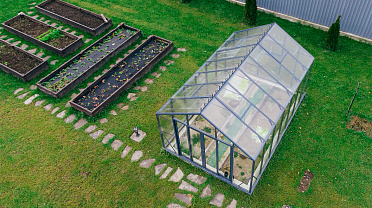 Выверенные пропорции и прямые стенки формируют удобное и функциональное пространство внутри. Теплица создаёт аккуратный архитектурный акцент на участке, обеспечивая комфортную работу с растениями и продуманную организацию посадок.