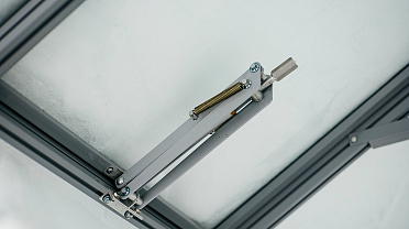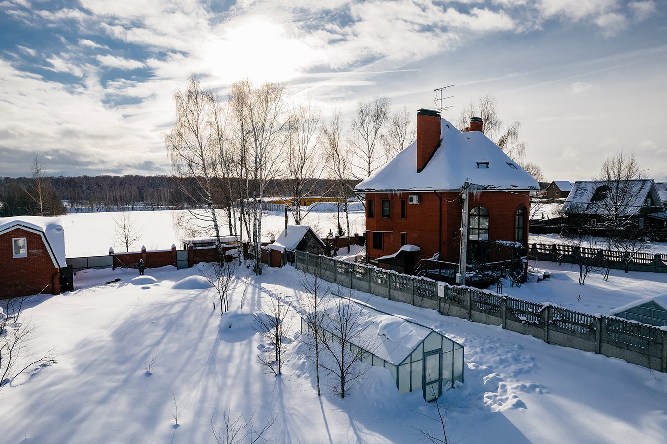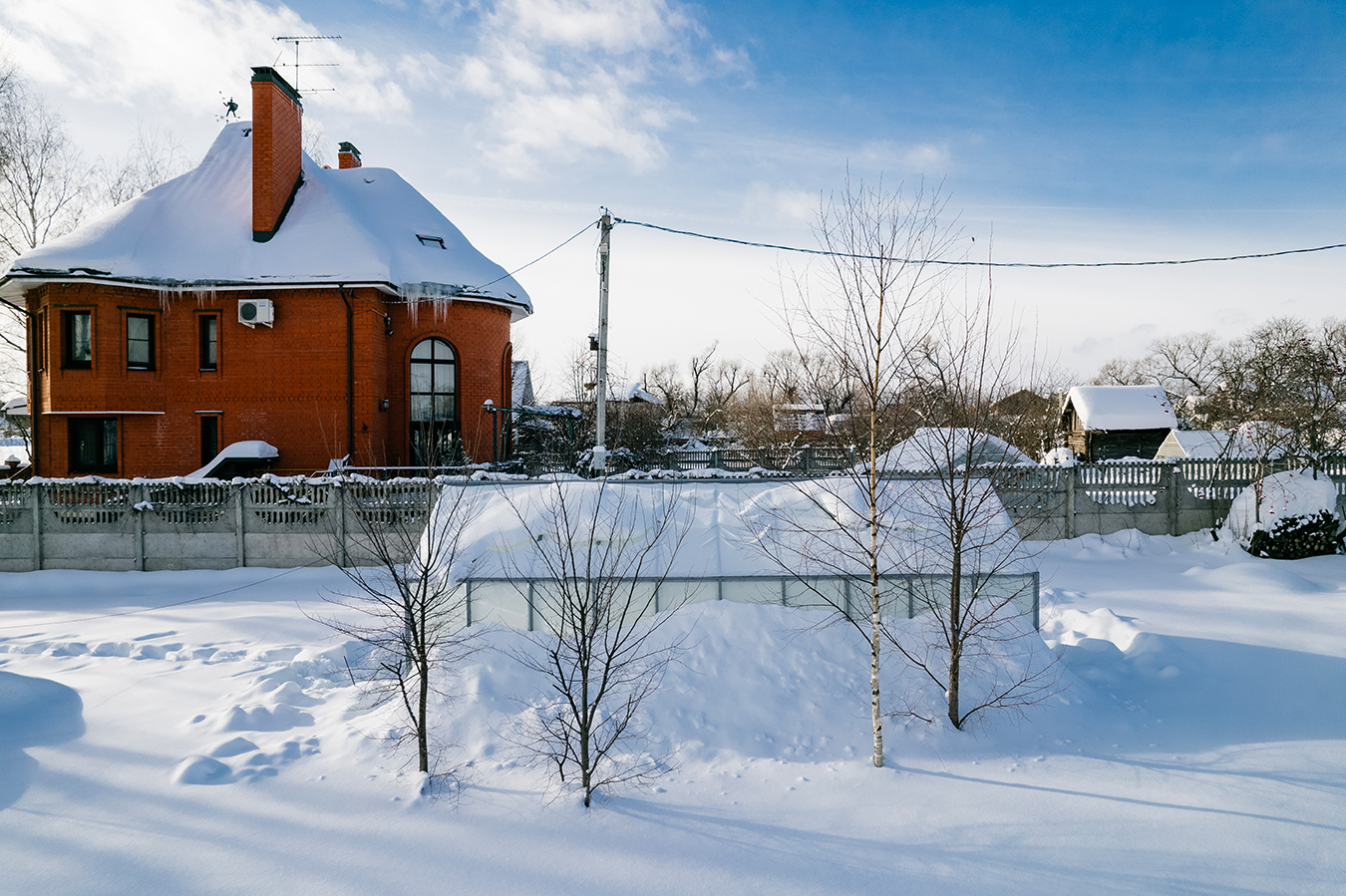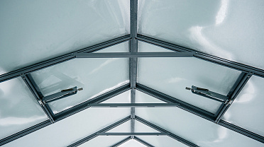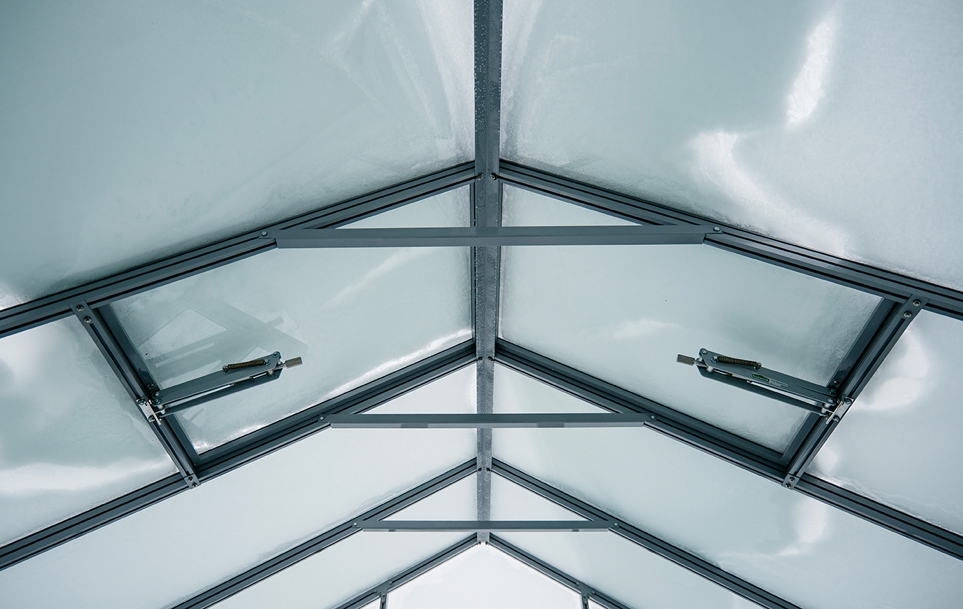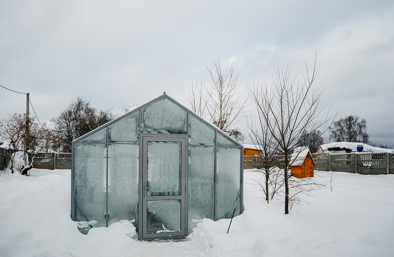 Сдержанное цветовое решение с акцентом на архитектуру и чистоту линий. Глубокий серый оттенок подчёркивает геометрию формы, а в зимний период теплица сохраняет уверенную устойчивость к снеговым нагрузкам, оставаясь выразительным элементом участка.